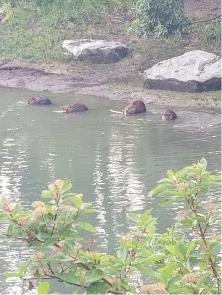 On any given evening around 8-8:30 take a leisurely walk down to Prince’s Island Park (PIP) and you might see 1-6 beavers either in the wetland on the most eastern end or at the other end by the Peace Bridge. Below is a photo taken by the Peace Bridge of four lovely beavers chewing their sticks! Two were swimming around in the wetland.